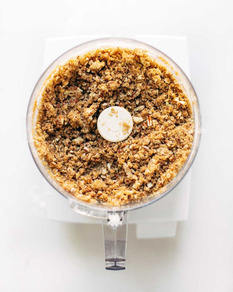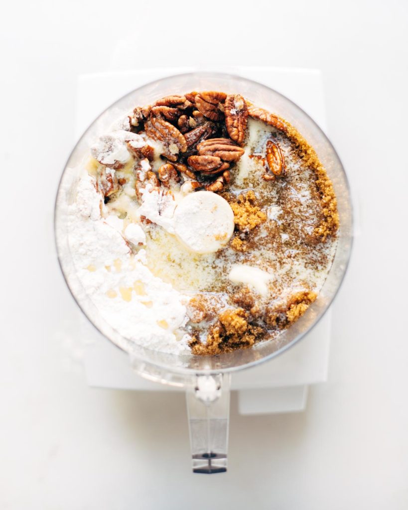 I like to Easy Button my life whenever possible, so I just toss those pecans, flour, butter, and brown sugar in my food processor and give it a go-round till it makes that crumbly, streusel-like topping that we know and love.